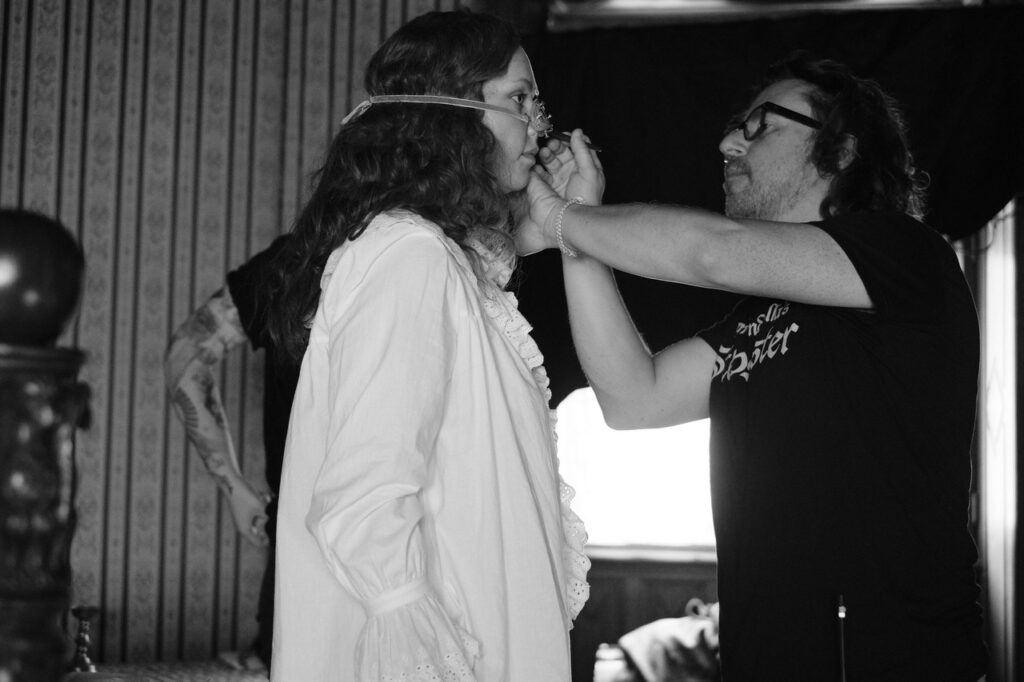 – Thomas: Ja, det var mange utfordringer… Vi hadde mange sminke- og kostymeskift under opptakene, så kontinuitetsflyten var veldig komplisert. Det var også kjempelange dager. Bare grunn-looken til Elvira (hovedrolleinnehaver Lea Myren) tok ca. 2 timer – silikon i kinnene, nese og dobbelthake, samt etter hvert også silikon på hals og armer, samt alle skadene på henne og hårtapet.